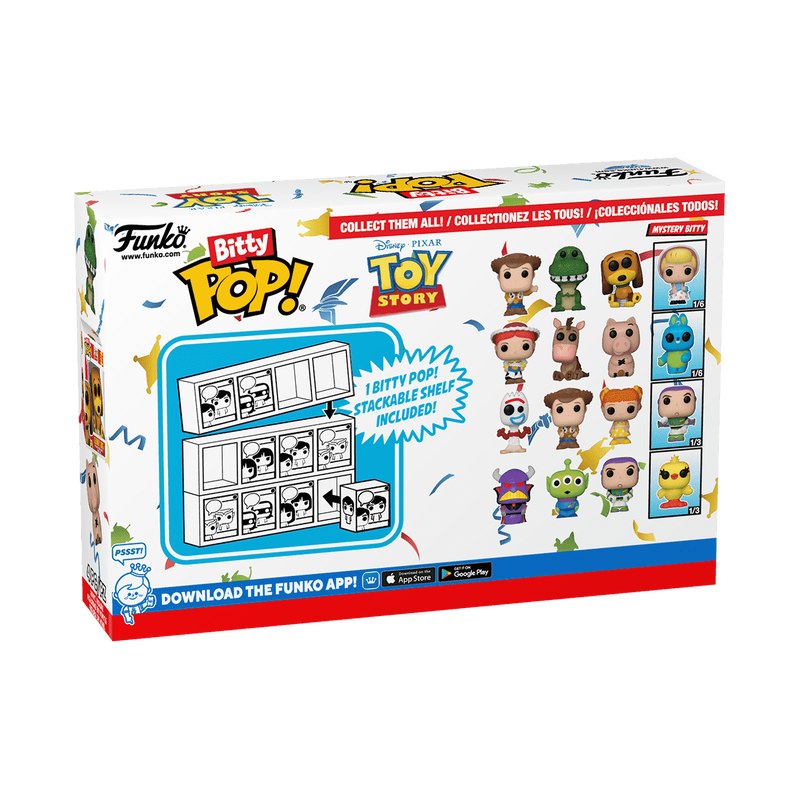 Your favorite Pops! have been shrunk into Bitty Pops! Expand your Disney Pixar’s Toy Story collection with this assortment of Bitty Pop! figures featuring your most beloved talking toys! This 4-pack includes Bitty Pop! Forky, Bitty Pop! Woody, Bitty Pop! Gabby Gabby, and a mystery Bitty Pop! figure. The possible mystery Bitty Pops! are Hyper Rare (1/6) Bunny, Hyper Rare (1/6) Bo Peep, Rare (1/3) Ducky, and Rare (1/3) Buzz Lightyear (flying).