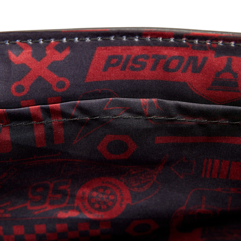 This crossbody features a racetrack on the front flap. An applique of Lightning McQueen actually moves around the track! Pretty epic, right?! The body of the bag is made of glossy patent faux leather for an elevated feel. You’ll find “95” written on the back of the bag and a checkered pattern on the crossbody strap.