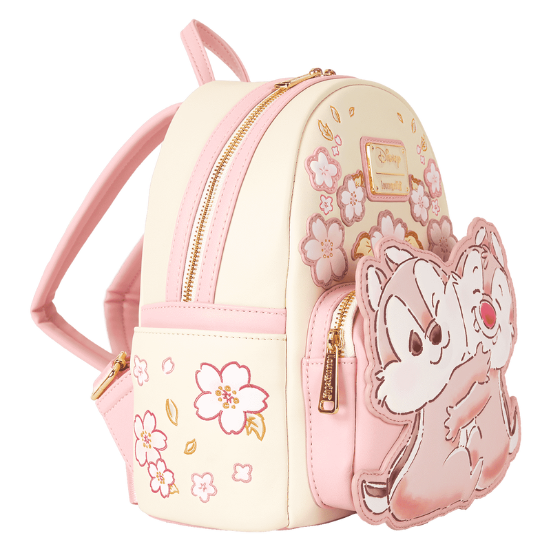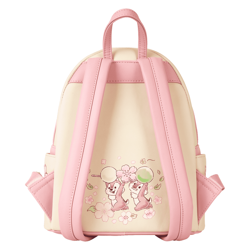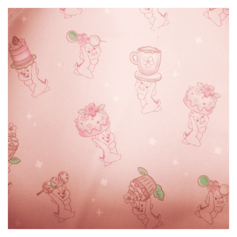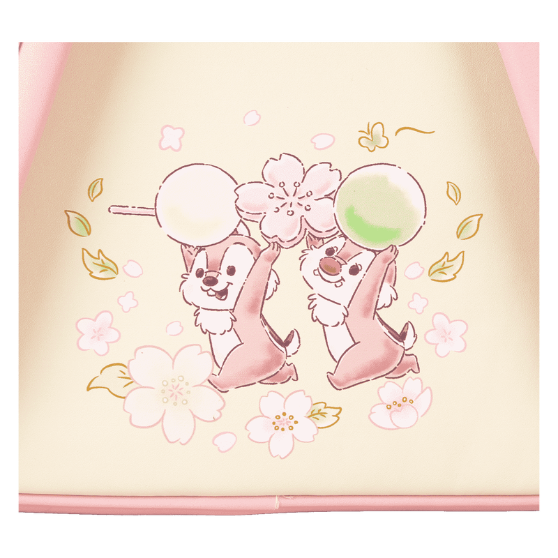 An oh-so-cute illustration of this dynamic duo hugging appears on the front pocket of the bag. Embroidered flowers bloom all around them! More florals (which are SO in this year) float along the sides and back of the bag. You’ll find another illustration of them on the back of the bag holding a dango.