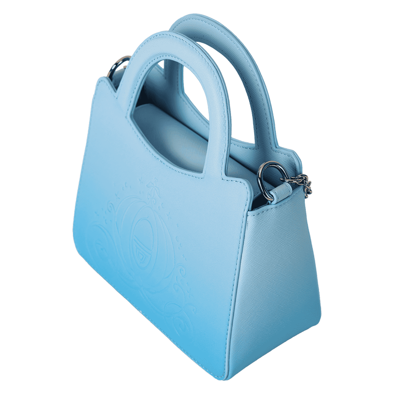 Step into your glass slippers and have a ball! This Disney’s Cinderella crossbody bag in light blue is ready to make a stunning entrance for a 75th-anniversary celebration. The front features an elegant, debossed print of Cinderella’s carriage. A silver chain and molded metal charm of her glass slipper add a touch of character. Flip the bag around, and you’ll find a debossed print of the beloved Disney’s characters, Jaq and Gus. Pack just what you need for the day—or an evening—of magical adventures