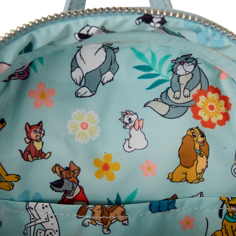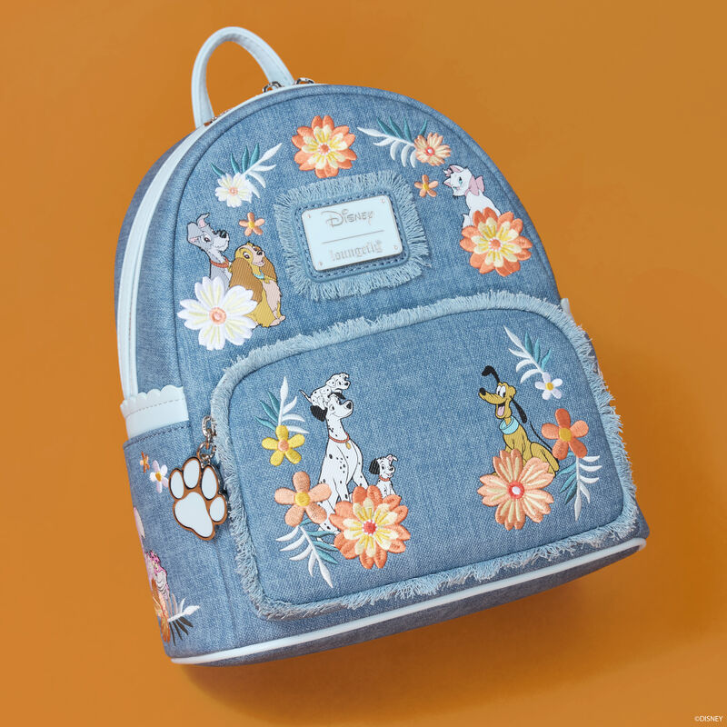 This denim mini backpack is covered in embroidered floral details – amongst them you’ll find images of your favorite Disney dogs and cats!
