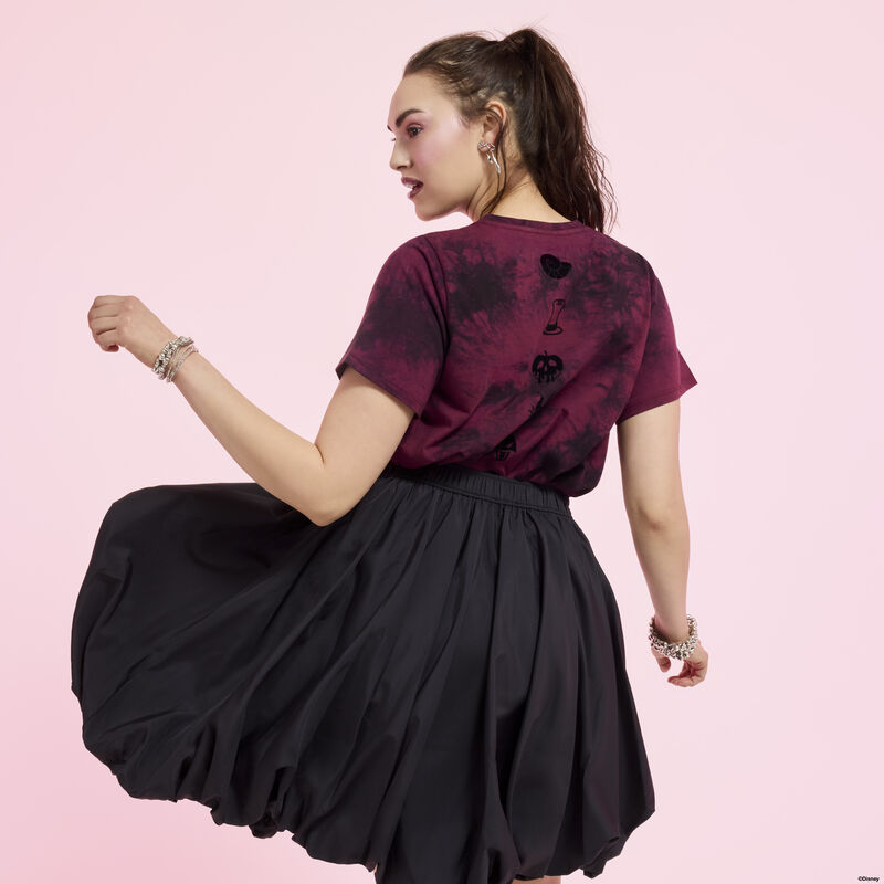 You’ll find “Happily Never After” in puff print on the front and flocked symbols of some of your fav Disney Villains on the back. Everything sits against a maroon-and-black tie dye background.