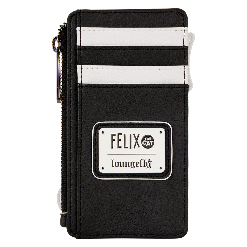 On the front, you’ll find an applique of Felix the Cat with his hands on his stomach and leaning back as he laughs. The background is black-and-white checkered. Turn the card holder around to find four black-and-white card slots and a zippered compartment to store small essentials.