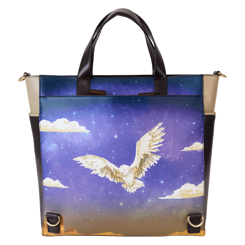 Catching the Hogwarts Express to embark on a magical journey? Arrive in brilliant style with our Harry Potter convertible tote bag. A breathtaking print of Harry Potter and his friends, heading toward Hogwarts School of Witchcraft and Wizardry with their robes and wands, unfolds. Mountains rise in the distance, and stars appear in the skies. A circular front pocket seamlessly flows into the scene, like magic. Flip the tote bag around, and you’ll find Hedwig flying through the starry skies. Pack your daily essentials in this roomy tote—and perhaps a few potions—to take off on imaginative adventures.