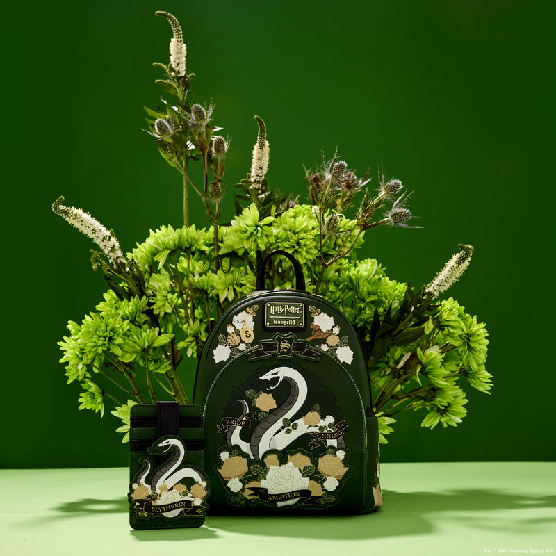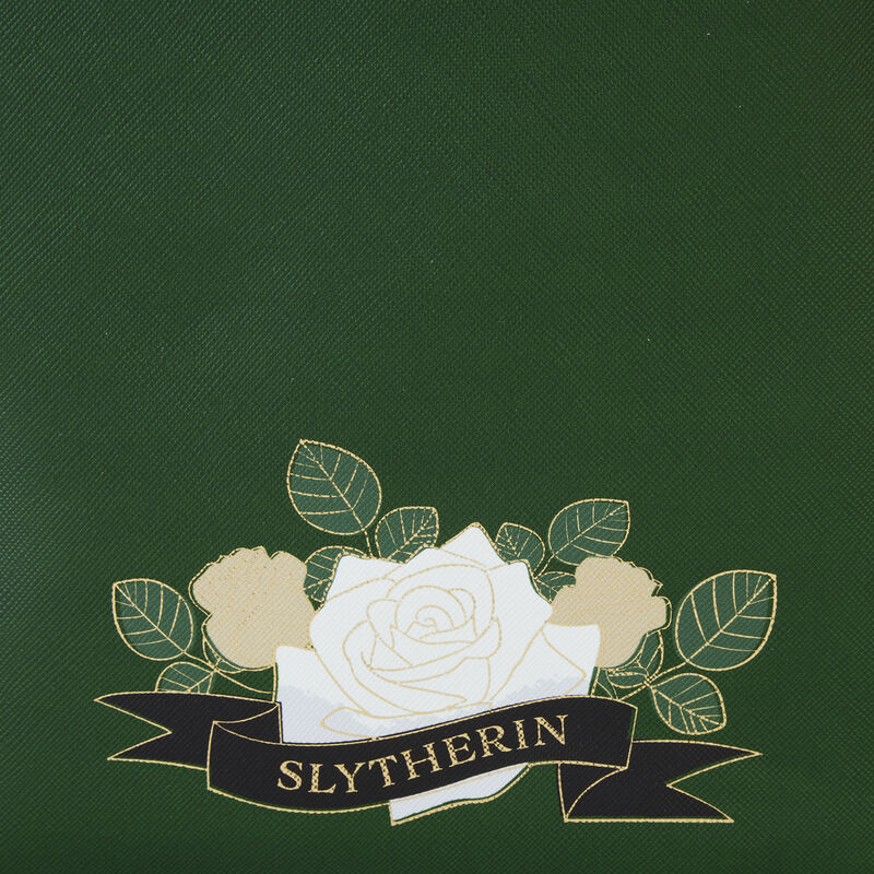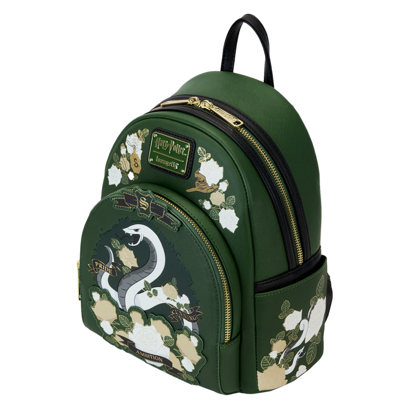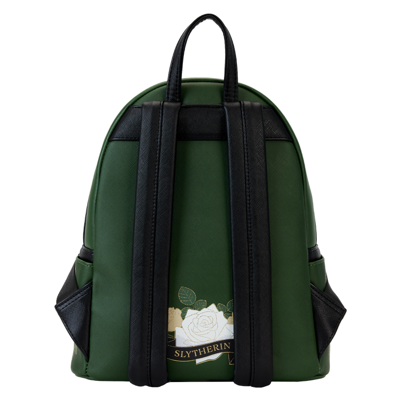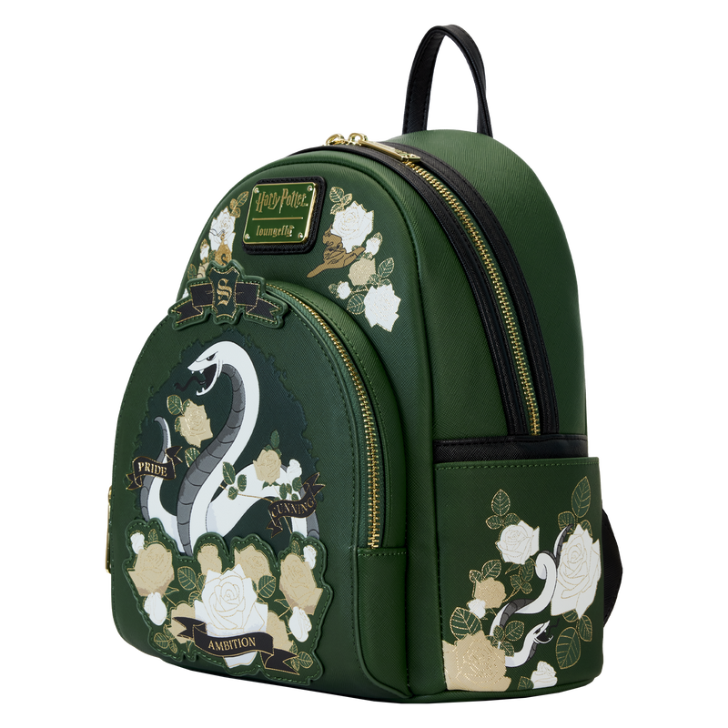 Stop and smell the roses while representing your House! Our Loungefly Harry Potter™ Slytherin House Tattoo Mini Backpack is perfect for growing your love of all things Harry Potter. On the front of this elegant forest-green backpack, an applique Slytherin symbol of the snake appears to strike among white and pale gold-colored flowers. Banners bearing the traits of the Slytherin House appear as well, including Pride, Cunning, and Ambition. Above, you’ll find more flowers and a sorting hat. Foil details add an elevated touch. On the side pockets, the Slytherin symbol, among the flowers, makes another appearance. The reverse side of the backpack carries a banner that says “Slytherin,” which is nestled among flowers.