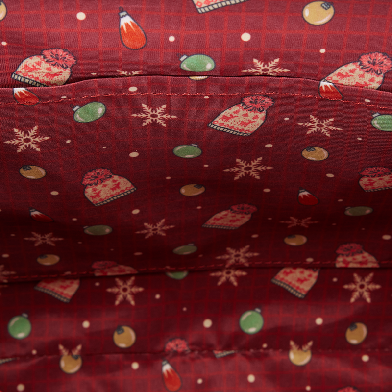 The body of this crossbody bag features images of Kevin, Harry, and Marv amongst other seasonal designs inspired by a holiday sweater. The top flap features metal charms of various items from the movie, like the McCallister home, pizza, and an iron! A 3D bow attached to the top handle brings the look together.