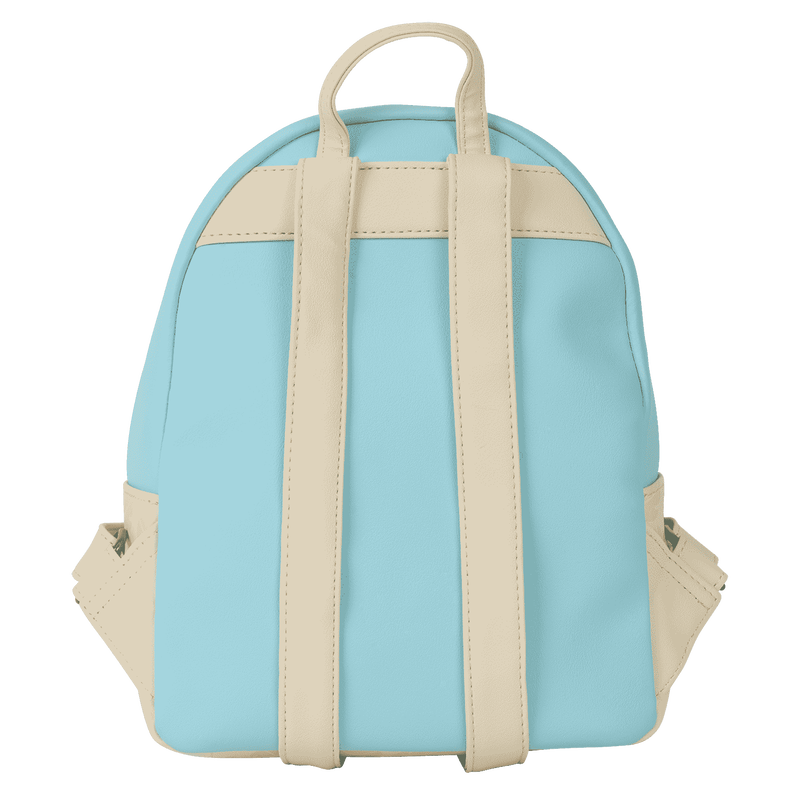 This mini backpack features Lilo and Stitch hanging out in a hammock tied between two palm trees. They listen to and play music together. Above them is perfectly clear sky.