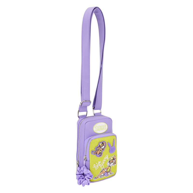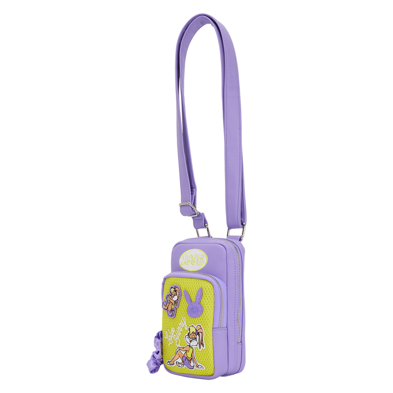 This bag is purple and green and features embroidered patches of Lola Bunny on the front against a knit fabric background. You’ll find “Lola Bunny” written across the front, too. A purple scrunchie zipper charm makes everything extra cute! Turn the bag around to find another image of Lola Bunny.