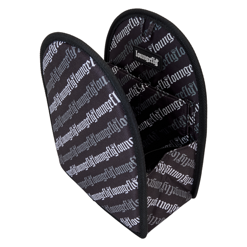 The Loungefly Mini Backpack Insert Organizer is made of nylon and features collapsible patch pockets, drop pockets, utility loops, lobster clips, D-rings, and printed details.