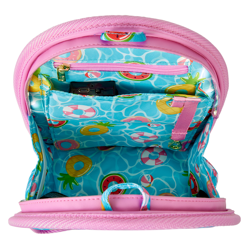 This new light-up organizer keeps you organized as you go from bag to bag! You’ll find features like a utility loop, loop with D-ring, nylon strap with lobster clip, zippered drop pocket, and collapsible patch pockets to keep all your essentials safe! Plus, it has an adorable summer pool day-themed pattern on it, including images of various pool floats and beach balls floating on the water’s surface.