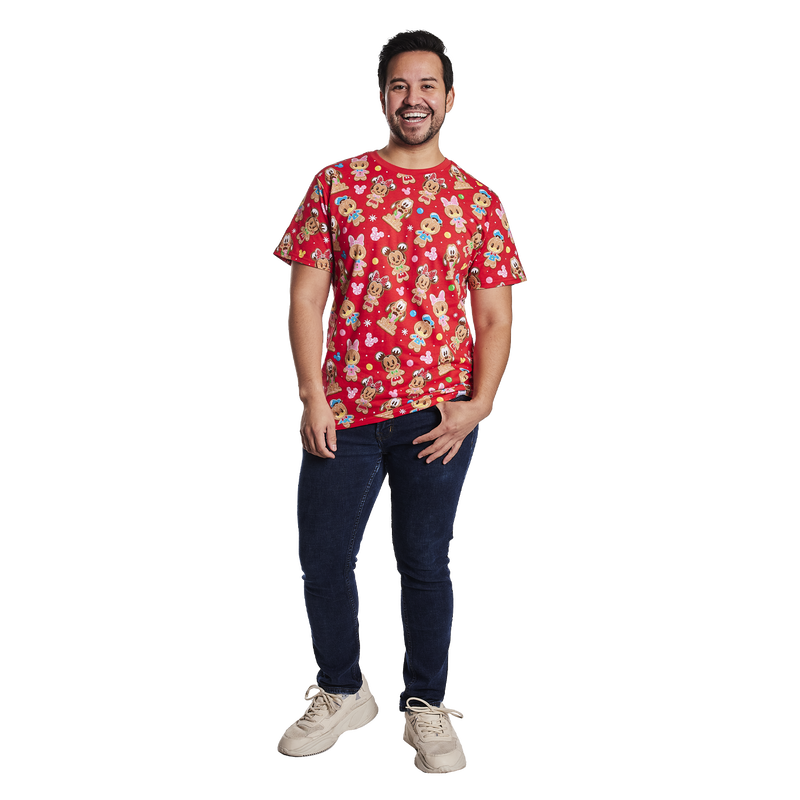 Treat yourself to a homemade tradition! The Loungefly Gingerbread Mickey and Friends Unisex Tee puts the icing on a picture-perfect holiday wardrobe. This cozy tee features an all-over print of candy and iced snowflakes on a red background. Mickey and his friends take on a cookie-inspired look as they join the party. Look closely and you’ll also find Minnie, Donald, Daisy, and Pluto! This tee shirt makes a tasteful addition to your holiday festivities and is the perfect recipe for winter fun.