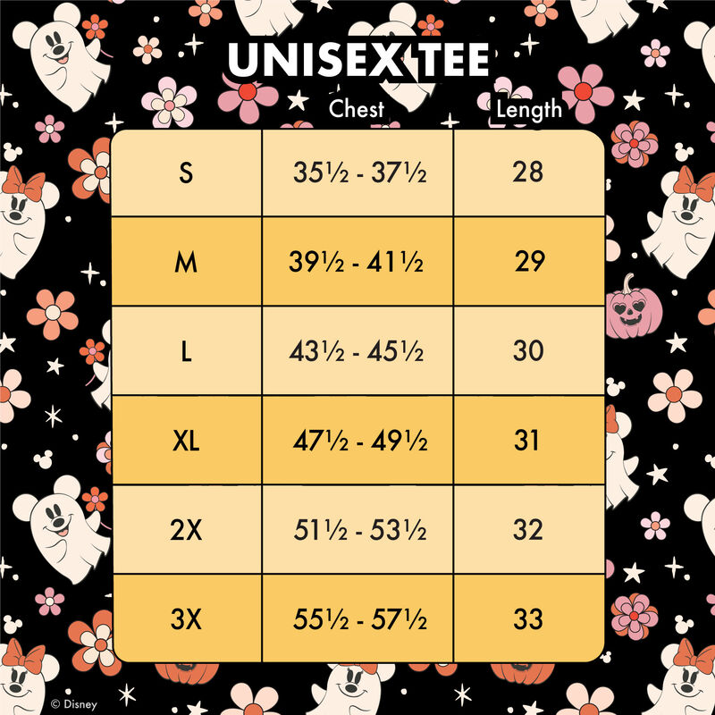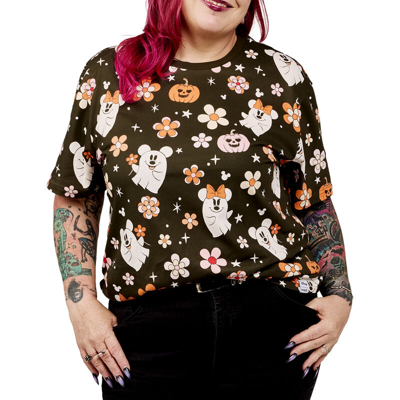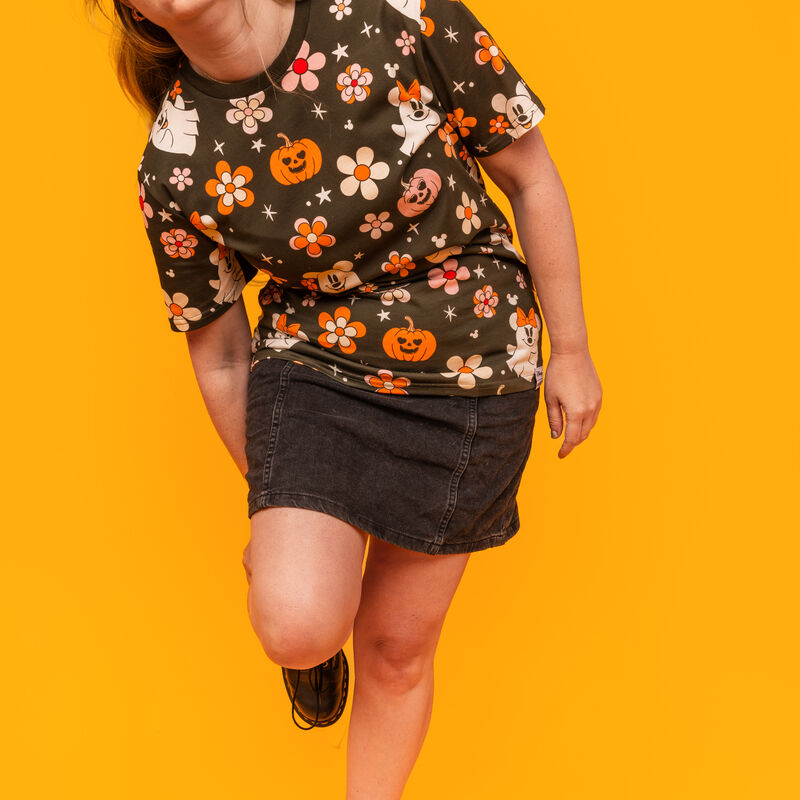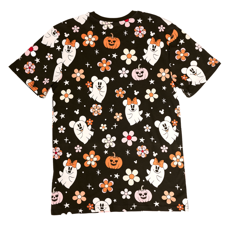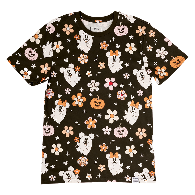 You’re not hallucinating – those are, in fact, the cutest ghosts you’ve ever seen. These adora-boo apparitions float through a starry sky in an all-over print of flowers and pumpkins. See if you can find hidden Mickey silhouettes sprinkled throughout the tee shirt’s design! These fashionable phantoms make a darling addition to any outfit and are thrilled to join you on your next haunt.