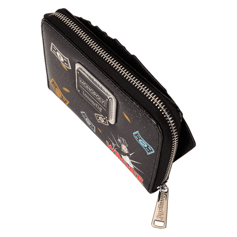 Pass GO and hold onto your hat! Advance to the Boardwalk with this fashionable Monopoly wallet, which is perfect for collecting all your game winnings. The entire accessory shimmers in glittery black faux patent leather. An applique of colorful Monopoly paper bills is fanned out across the front. Flip the wallet over, and you’ll find a print of the word “Winner,” along with Mr. Monopoly himself surrounded by colorful Monopoly money. Secure your valuables for a day of touring Marvin Gardens, Park Place, or New York Avenue.