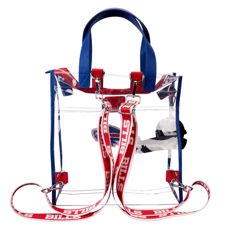 Feeling game-day ready? Cheer on your favorite football team with this convertible tote bag! The clear design makes it easy to bring your belongings into the stadium, and versatile shoulder straps help to keep your bag close as you wander the crowds. A chenille patch of the Bills logo, a helmet-shaped bag charm, and coordinating team colors give this bag an elevated look. No need to sacrifice your style at the big game – this accessory is the perfect combination of fashion and function.