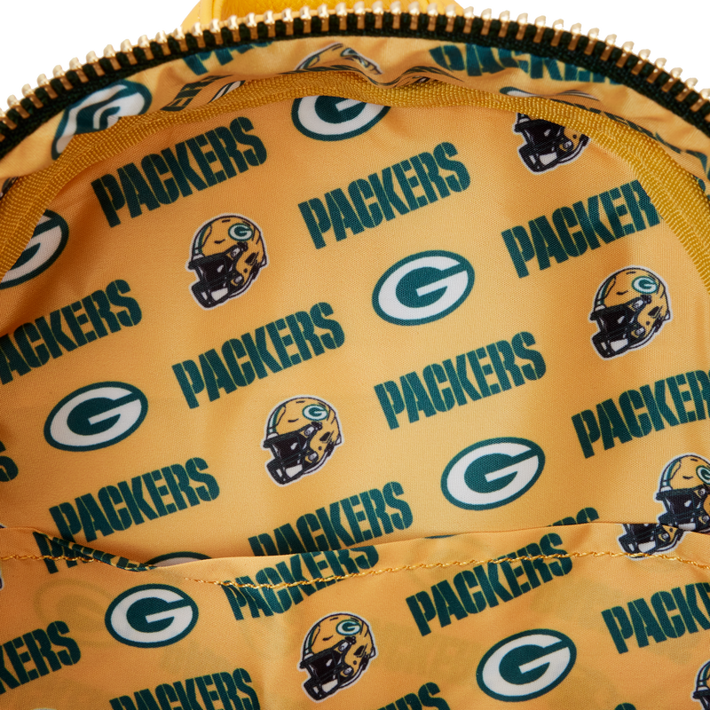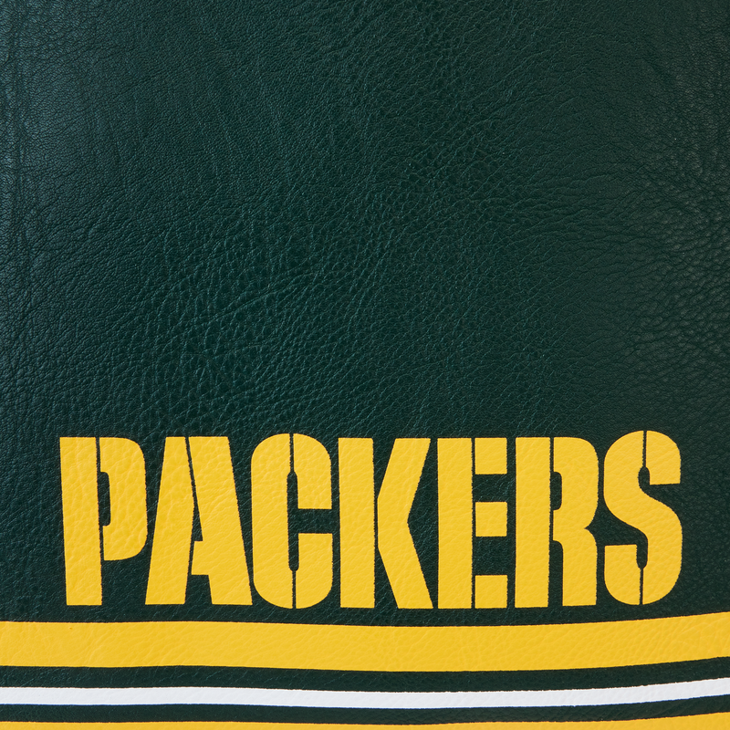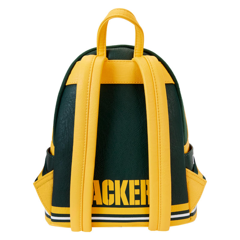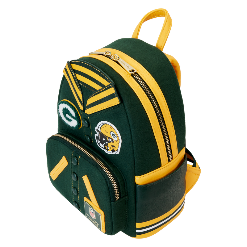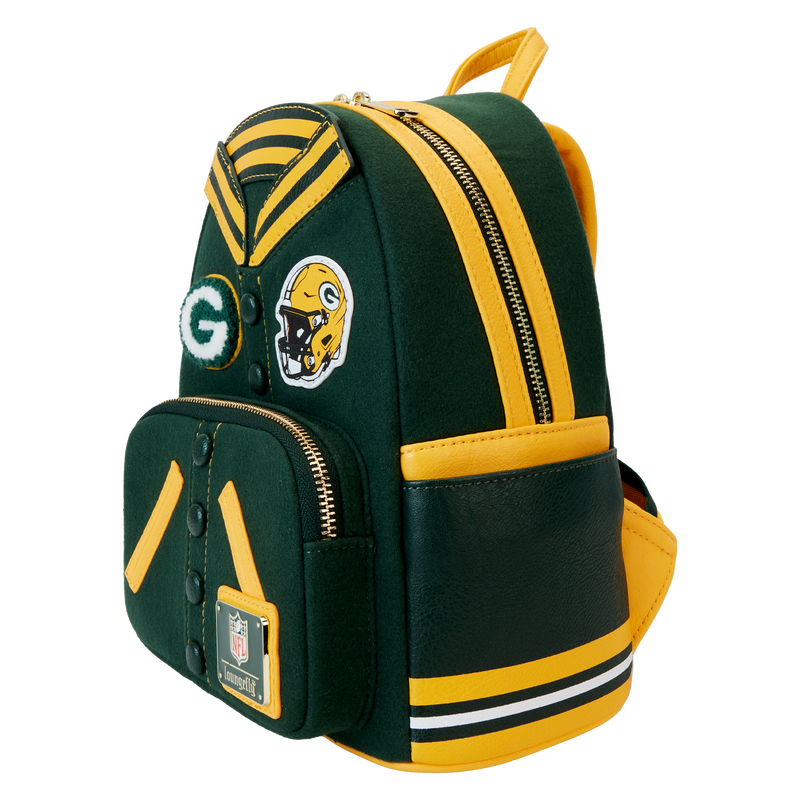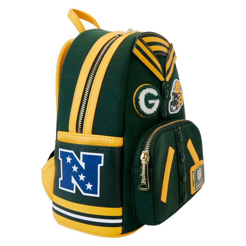 Hip-hip-hooray! Cheer your team in style all day! Our sturdy Green Bay Packers Varsity Mini Backpack will stand out in the crowd. This backpack, fashioned as a varsity jacket, scores big points in details. A chenille patch logo and helmet patch add a winning look, along with green and yellow jersey material appliques in Green Bay Packers colors. Real metal snaps also line the front for a “buttoned-up” look. Pack just what you need for the day to show off your team pride.