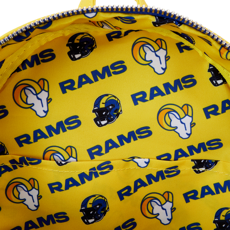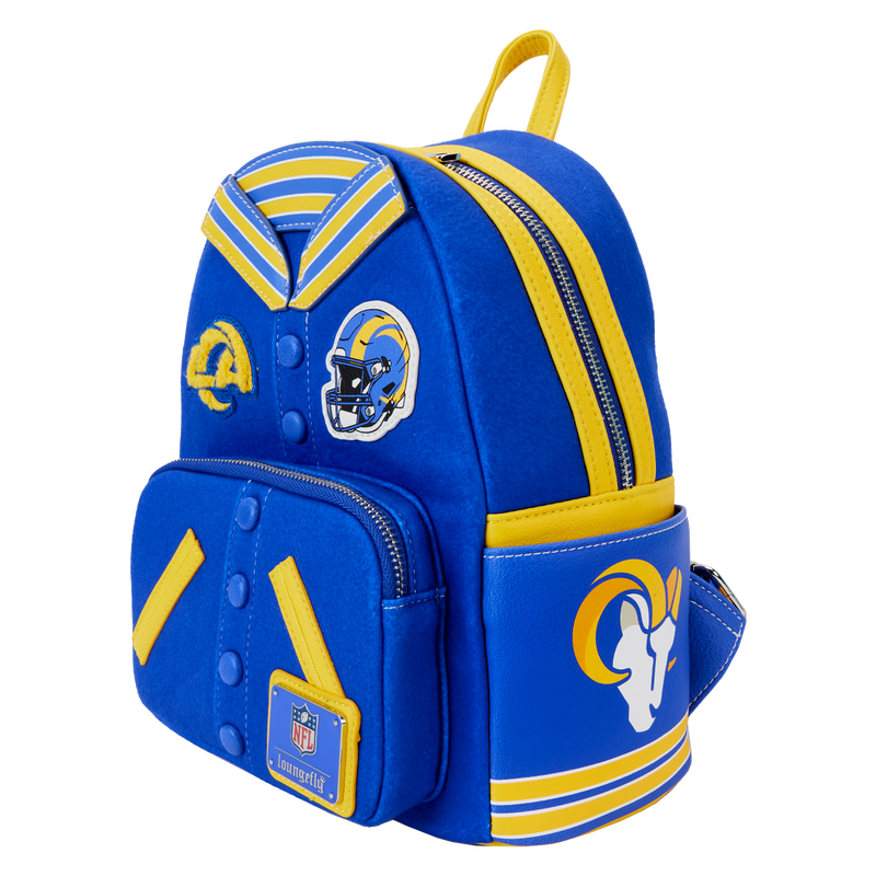 Show your colors proud and true—you’ve got spirit, yes you do! Cheer your team in style! Our sturdy Los Angeles Rams Varsity Mini Backpack will stand out in the crowd. This backpack, fashioned as a varsity jacket, scores big points in details. A chenille patch logo and helmet patch add a winning look, along with royal blue and yellow jersey material appliques in Los Angeles Rams colors. Real metal snaps also line the front for a “buttoned-up” look. Pack just what you need for the day to show off your team pride.