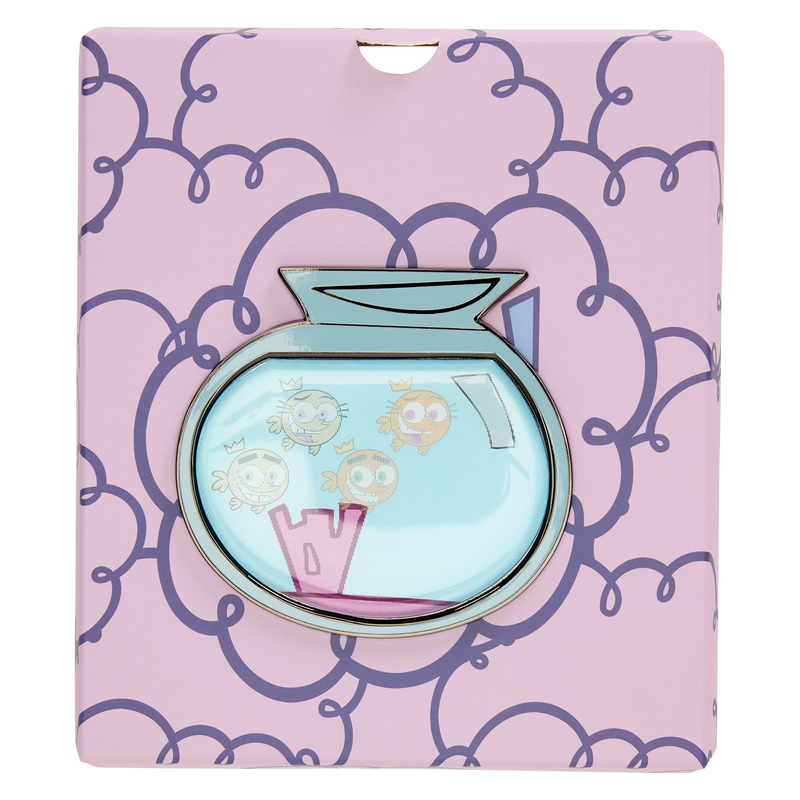 This 3″ collector box pin features Cosmo and Wanda as goldfish in a bowl. The pin features an epoxy dome and a lenticular feature that shows Cosmo and Wanda “swimming” in the bowl! This pin is limited edition 700, making it an extra special piece to collect and display!