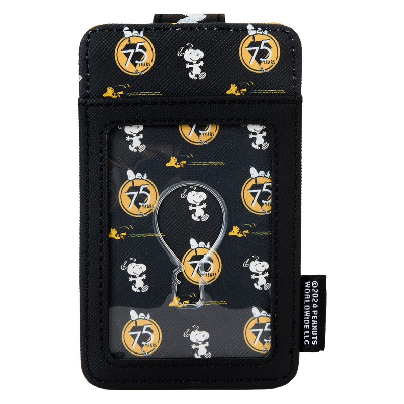 Happiness is…a big celebratory feeling you can take with you wherever you go. Celebrate the 75th anniversary of Peanuts™ with our card holder featuring Woodstock on the front in a hot-air balloon. Charlie Brown’s signature wavy stripes also make a special appearance. The reverse side has a clear ID slot with a die-cut shape of a hot-air balloon. Secure important cards for the day and celebrate a milestone anniversary with a little character of your own.