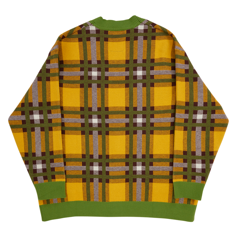 This knit cardigan features yellow-and-green plaid with green accents at the collar, cuffs, pockets, and over the elbows. You’ll find “Pluto” written inside a bone in the upper right corner. Pluto also peeks out from one of the pockets!