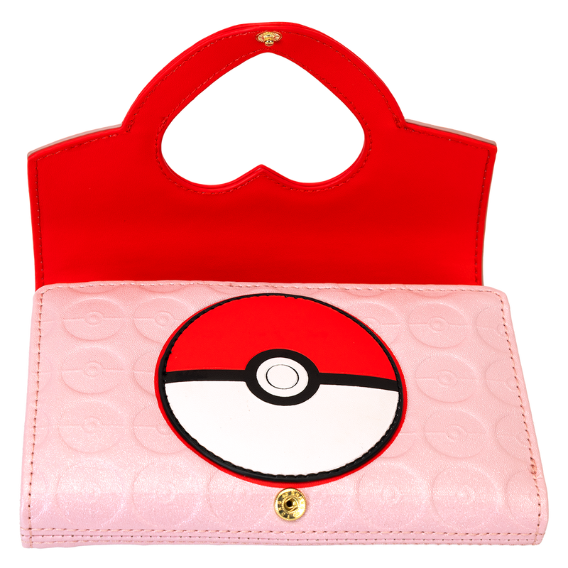 Hey, fashionable Trainers! Throw in some extra fun with this exclusive Pokémon bifold wallet. Pink glitter vegan leather adds extra sparkle, and a debossed Pokémon all-over pattern provides an elegant touch of fandom. On the front flap, you’ll find a die-cut window shape of a heart, with a print of a Pokémon ball peeking through. Lift the flap, and the entire ball is revealed. Secure your valuables and choose your own adventures in style.