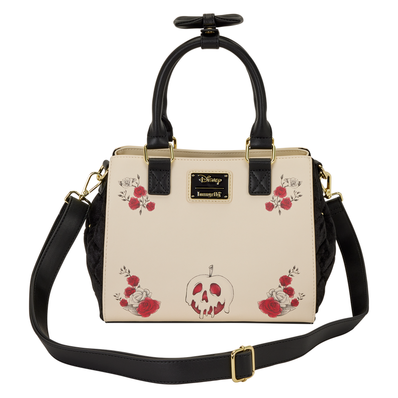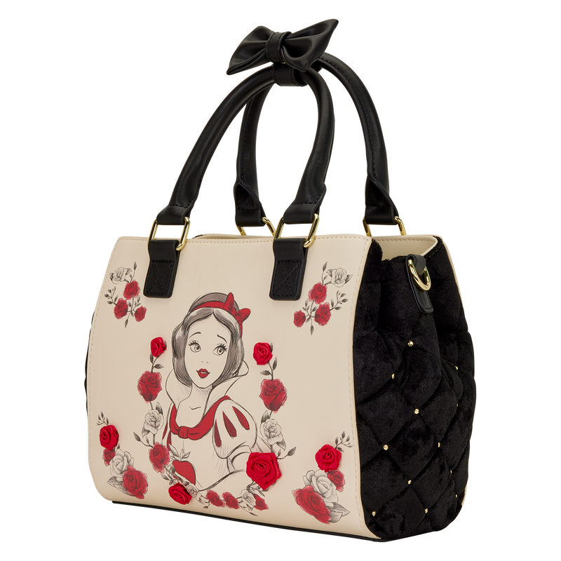 This tote features Disney’s Snow White in gorgeous artwork surrounded by 3D roses. The sides of the bag feature quilted velvet with metal studs. Turn the bag around to find more rose details and an illustration of a poison apple. You can carry this around over your shoulder with the crossbody strap or by the handles, which have a removeable 3D bow for an extra cute detail!
