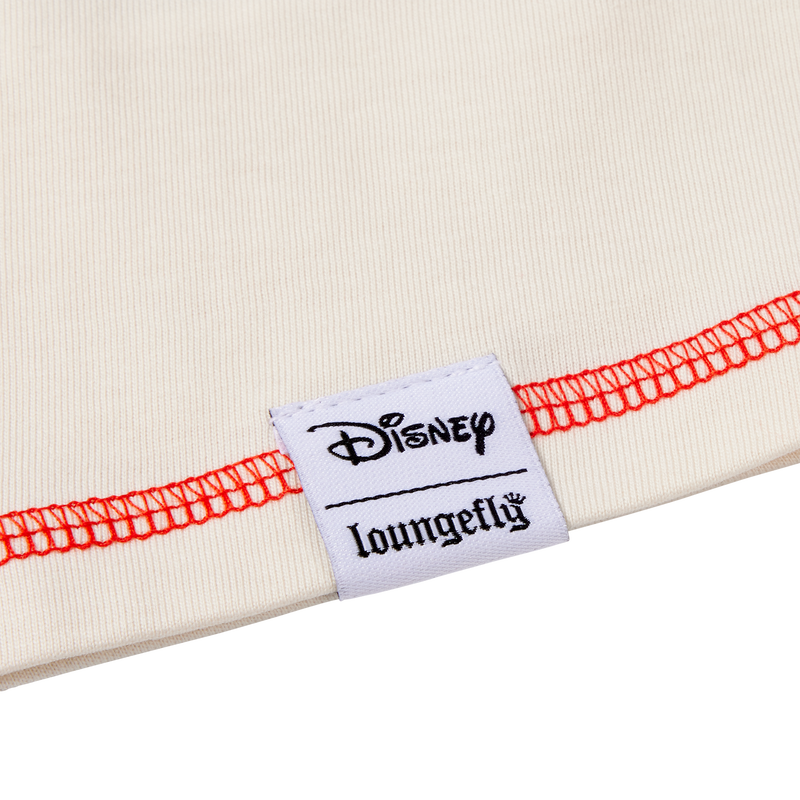 Feel like you’ve been transported into one of your favorite Disney tales when you wear this tee! You’ll find an illustration of Snow White on the front, her silhouette sits within an apple. Flowers bloom around her. The words “Just One Bite” are written at the top. Red trim on the sleeves, collar, and hem brings the whole look together.