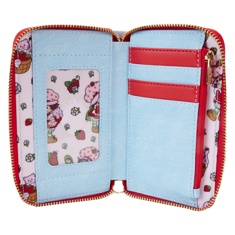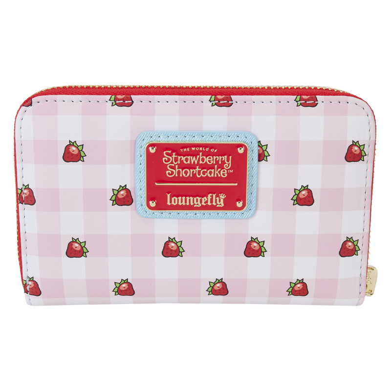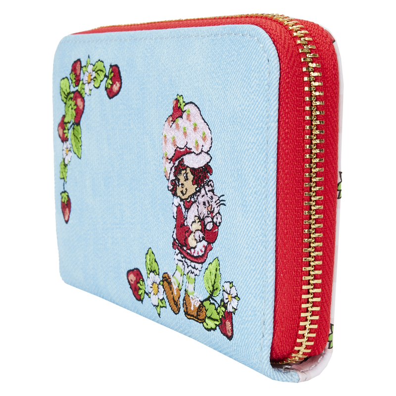The Loungefly Strawberry Shortcake Denim Gingham Zip-Around Wallet is made of vegan leather (polyurethane). Wallet zips closed with gold-colored metal hardware. Additional features include printed and embroidered details. Take note of the coordinating inside lining.