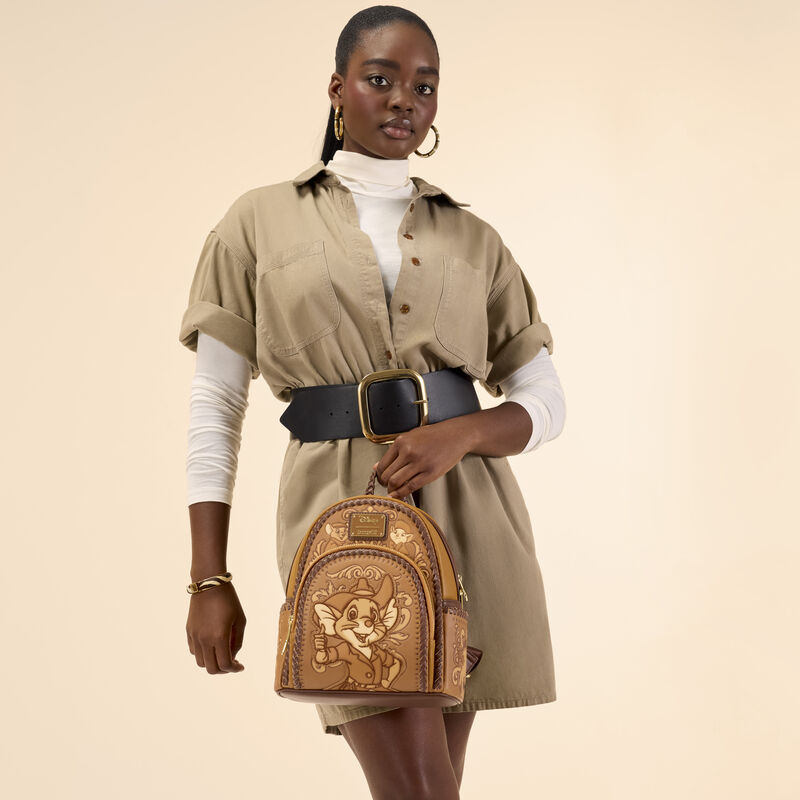 This mini backpack is inspired by Disney’s Rescuers Down Under. You’ll find Jake front and center on the front pocket in debossed and applique detail. Bernard and Miss Bianca can be seen above the front pocket. More animal friends are visible on the side pockets. Cowboy faux leather and a braided top handle bring this look together.