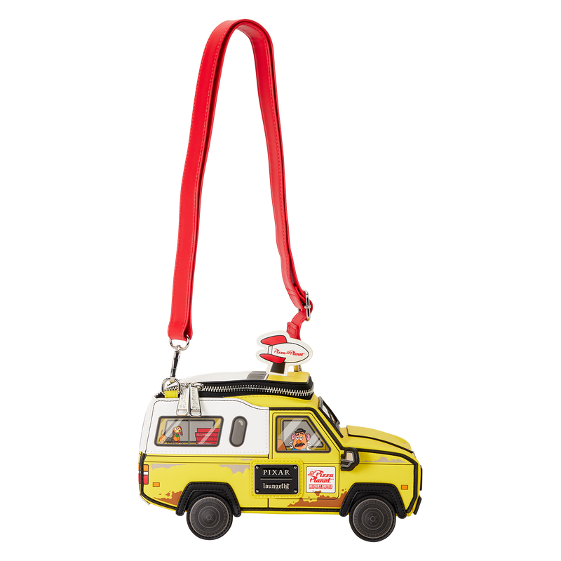 This figural bag is in the shape of a Pizza Planet delivery van. You’ll find an applique rocket on top that lights up, the headlights light up, AND the wheels move! How epic!
