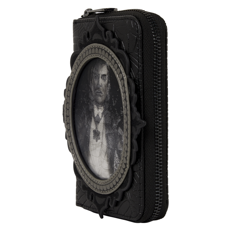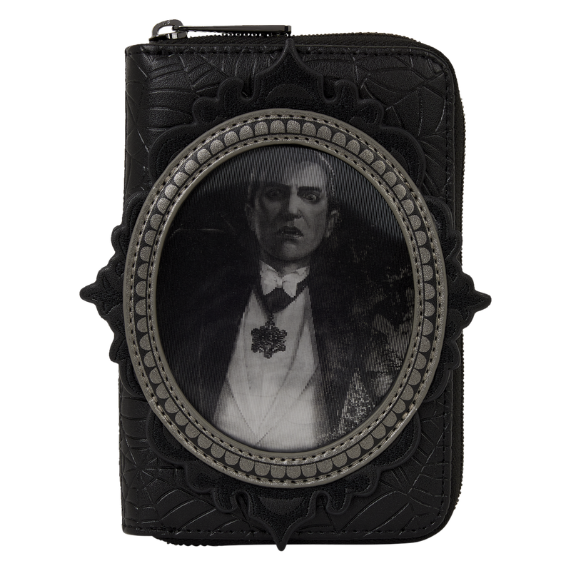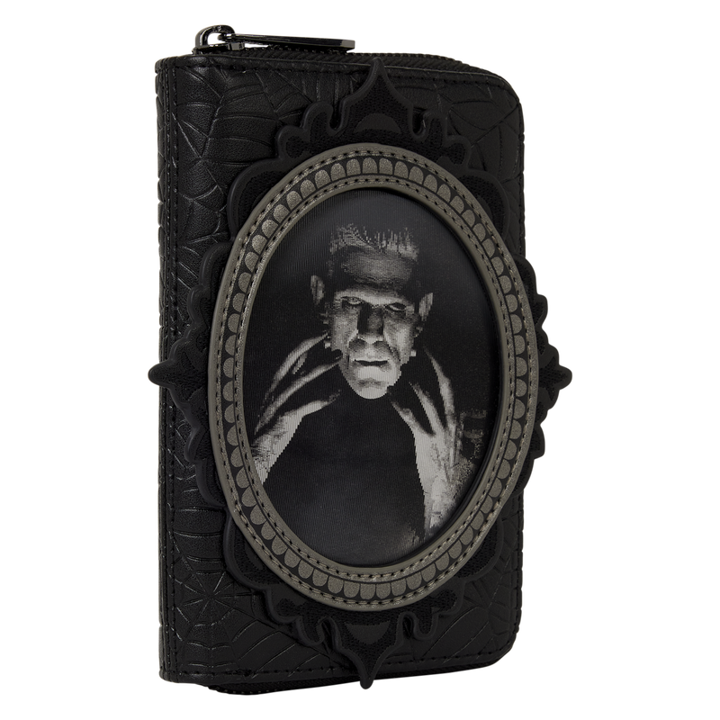 The front of the wallet features a cameo-style frame. Within it is a lenticular panel that shows different portraits of classic Universal Monsters, like Frankenstein, the Creature from the Black Lagoon, Dracula, and the Mummy! Inside, there are four card slots and one clear slot for an ID.